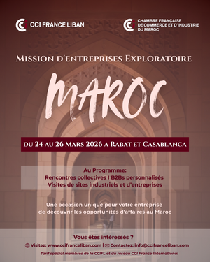 La CCI France Liban, en partenariat avec la Chambre Française de Commerce et d'Industrie du Maroc, vous invite à prendre part à la mission d’entreprises exploratoire du Maroc, conduite par Monsieur Maxence DUAULT, Président de la CCI France Liban, qui se tiendra du 24 au 26 mars 2026.