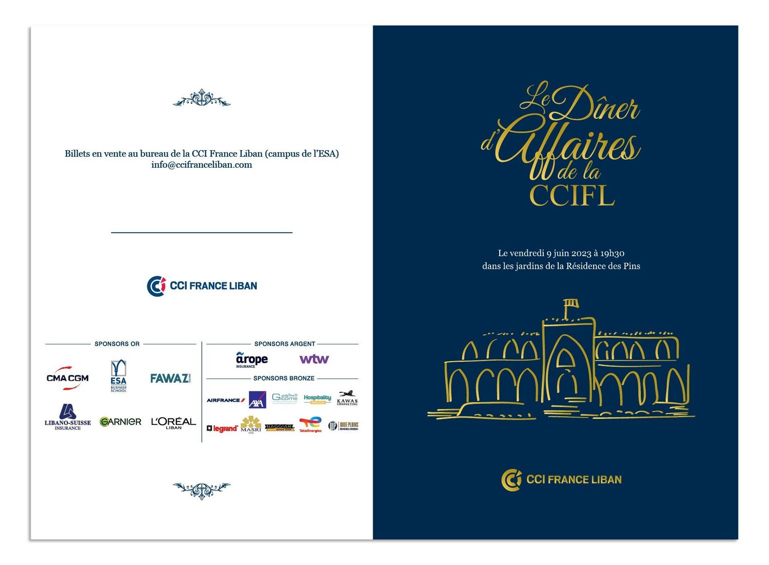Billets en vente au bureau de la CCI France Liban (campus de l’ESA) ou contactez-nous sur info@ccifranceliban.com ou +961 1 373 373 ext 1164