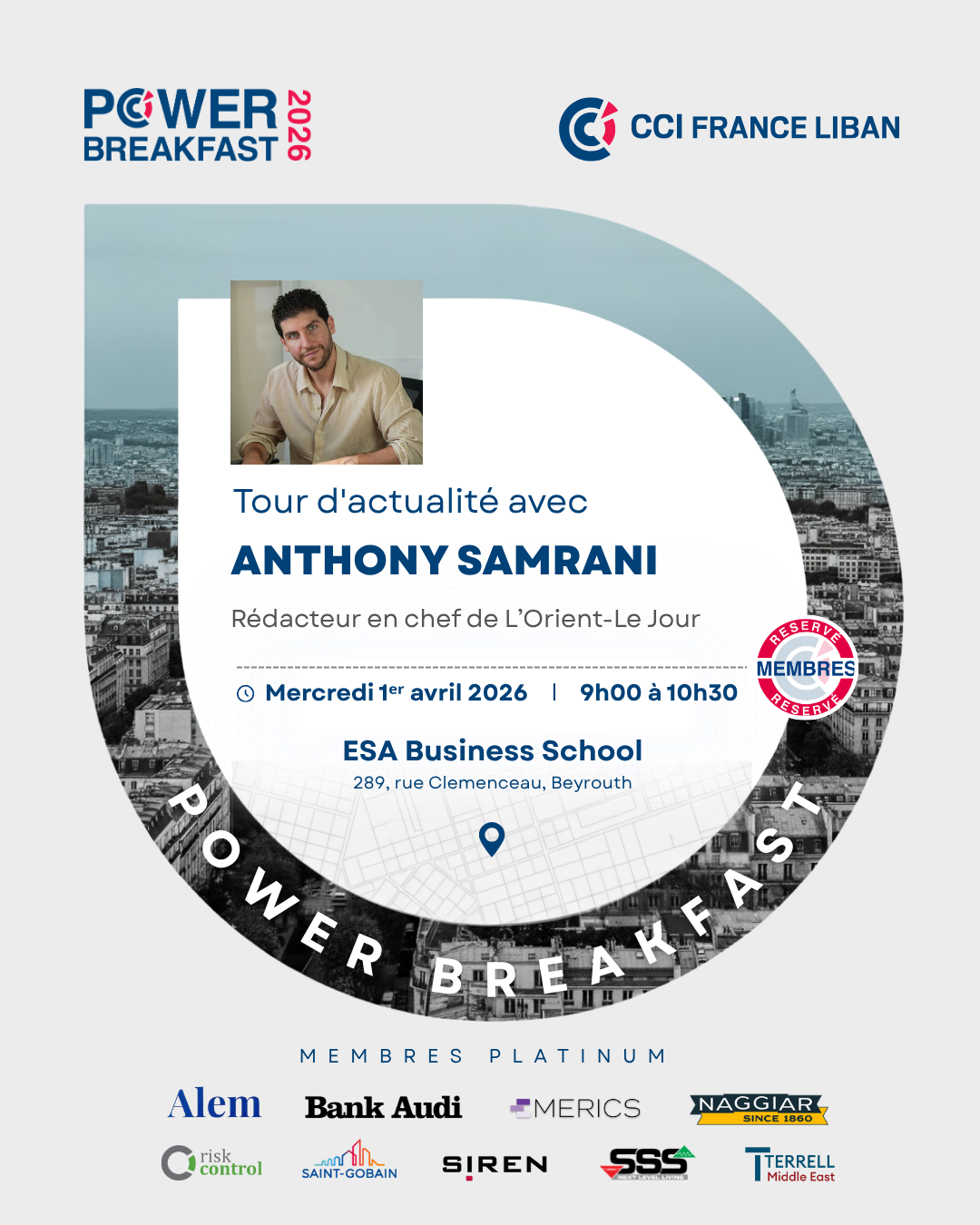 Le Power Breakfast est un nouveau concept mensuel de la CCI France Liban, en partenariat avec le SER de l’Ambassade de France au Liban, conçu pour offrir à ses membres une opportunité unique de rencontrer des personnalités influentes du monde économique et des affaires.