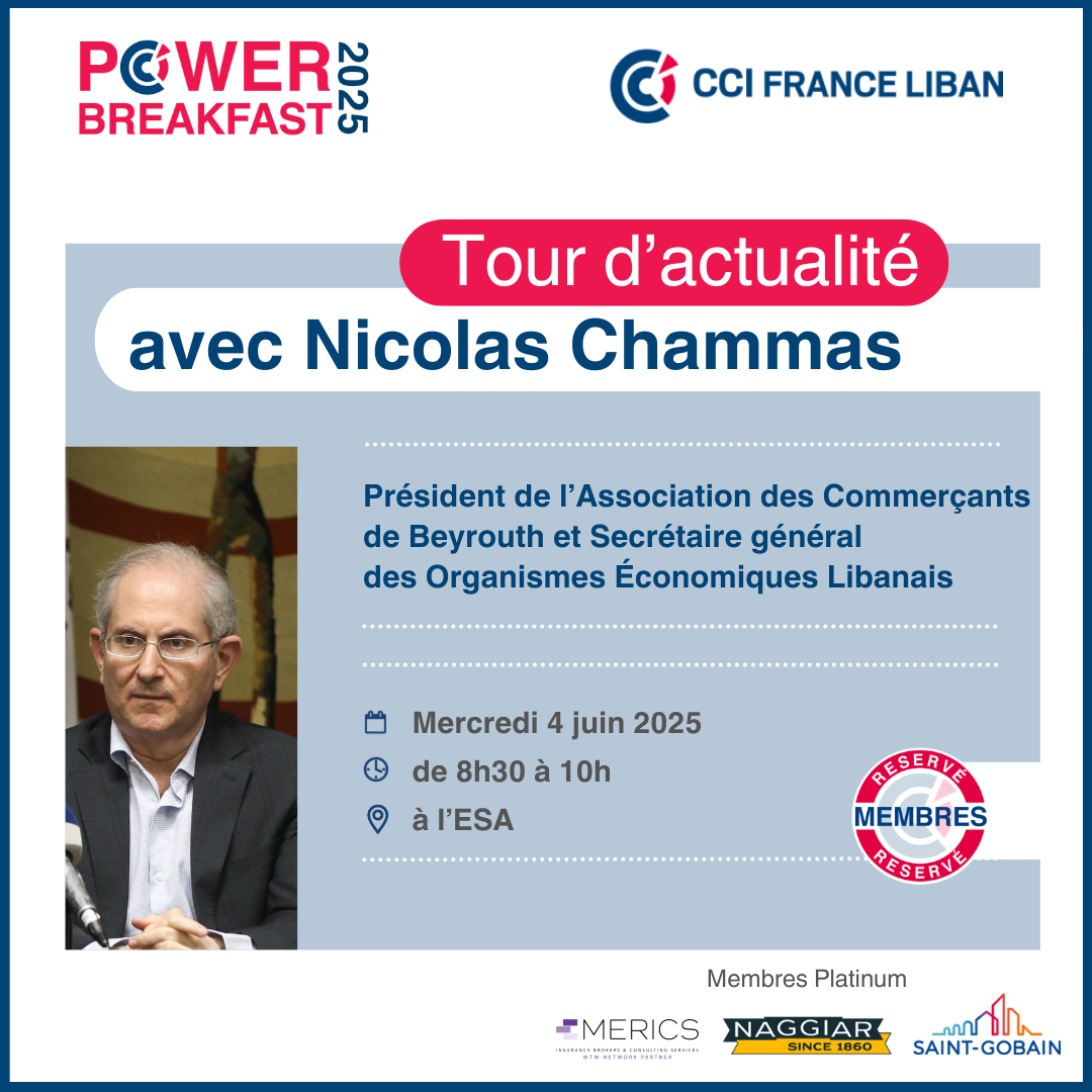 Le Power Breakfast est un nouveau concept mensuel de la CCI France Liban, en partenariat avec le SER de l’Ambassade de France au Liban, conçu pour offrir à ses membres une opportunité unique de rencontrer des personnalités influentes du monde économique et des affaires.