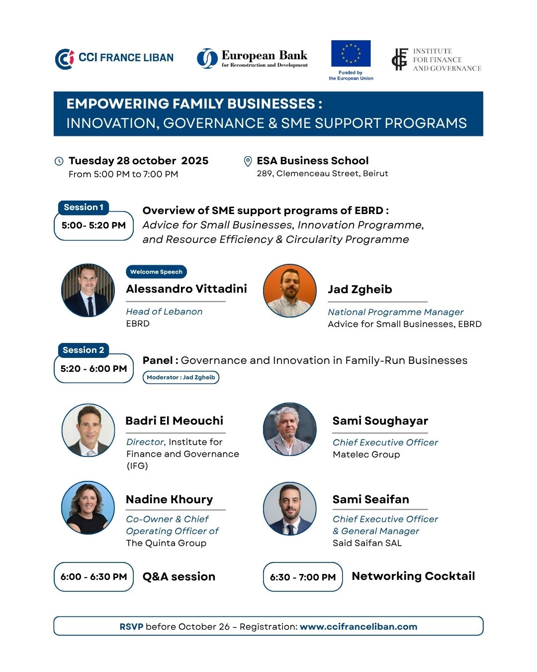 Panel: Governance and Innovation in Family-Run Businesses -Badri El Meouchi, Director, Institute for Finance and Governance (IFG) -Sami Soughayar, Chief Executive Officer, Matelec Group -Nadine Khoury, Co-Owner & Chief Operating Officer, The Quinta Group -Sami Seaifan, Chief Executive Officer & General Manager, Saif Saifan SAL |