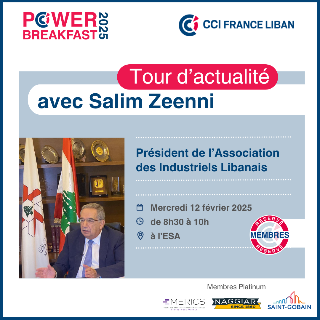 Le Power Breakfast est un nouveau concept mensuel de la CCI France Liban, en partenariat avec le SER de l’Ambassade de France au Liban, conçu pour offrir à ses membres une opportunité unique de rencontrer des personnalités influentes du monde économique et des affaires.